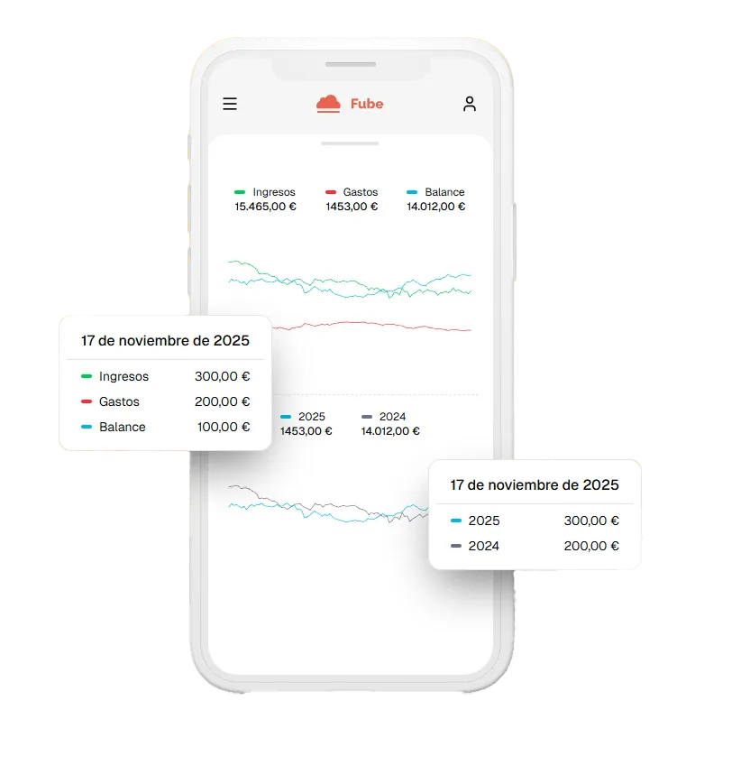 Fube ofrece un panel intuitivo con indicadores financieros actualizados en tiempo real. Con herramientas como la comparativa de balances y el desglose de ingresos por cliente, proporciona una visión completa para la gestión eficiente del negocio.